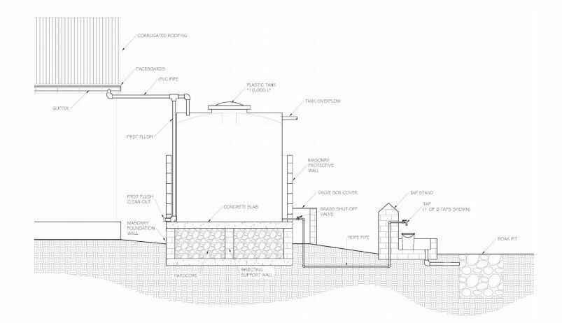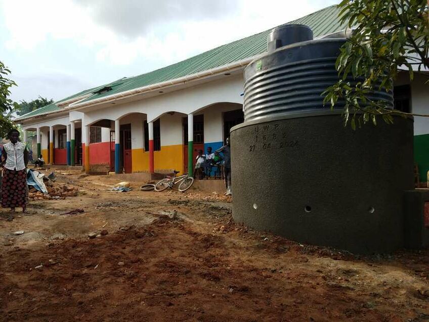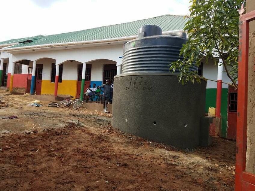 Our implementing partner, Ugandan Water Project, erected a 10,000-liter polyethylene tank on a base made of brick, hardcore, and cement. Once cured, the crew placed the tank on the base, made an overflow hole in the top of the structure and attached a pipe to it that extends six inches beyond the perimeter of the base. Crew members also attached face boards to the roof of the building adjacent to the tank in order to create a suitable surface to which they could attach the gutters that will allow water to flow from the metal roof to the tank. Just before the outlet pipe reaches the tank, a “T” joint was inserted to create a first flush, a rudimentary filtration system that reduces the amount of debris and contaminants that enter the tank. The crew then constructed a protective wall around the tank and first flush, as well as a tap stand located slightly downhill from the tank. The rainwater collection system will be paired with four Sawyer Point One water filters in order to ensure that all water collection from the tank will be safe for drinking.