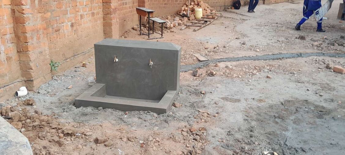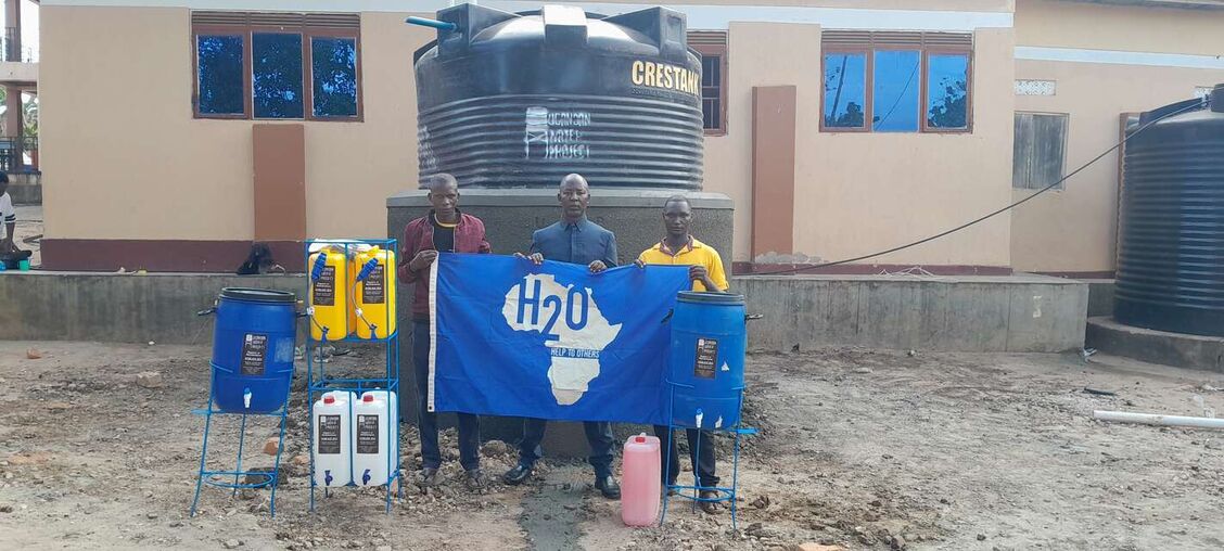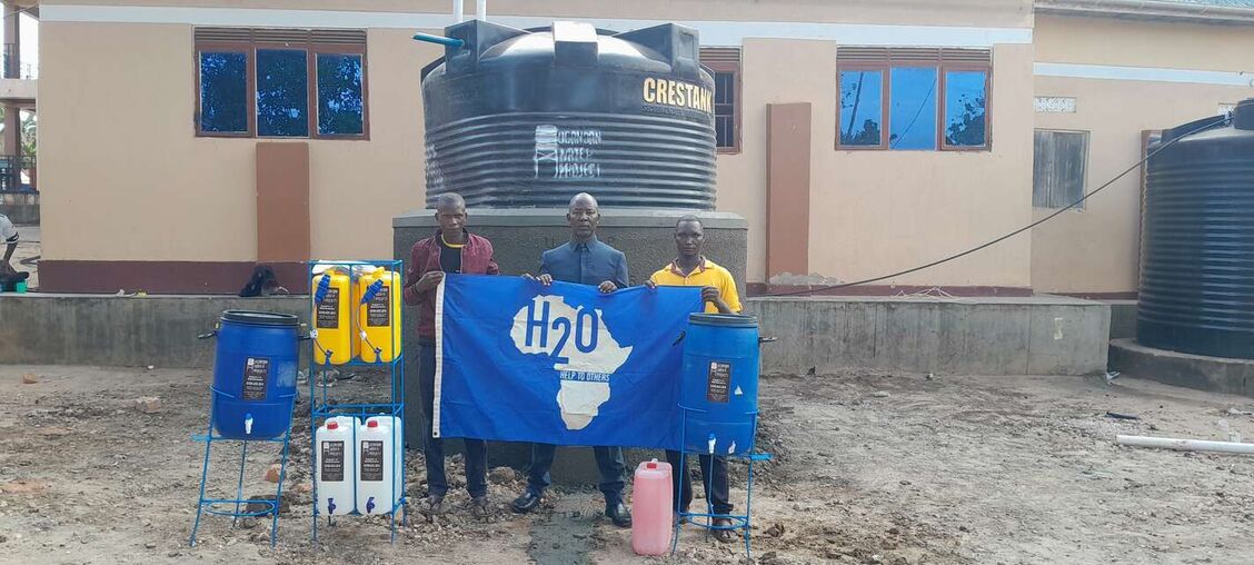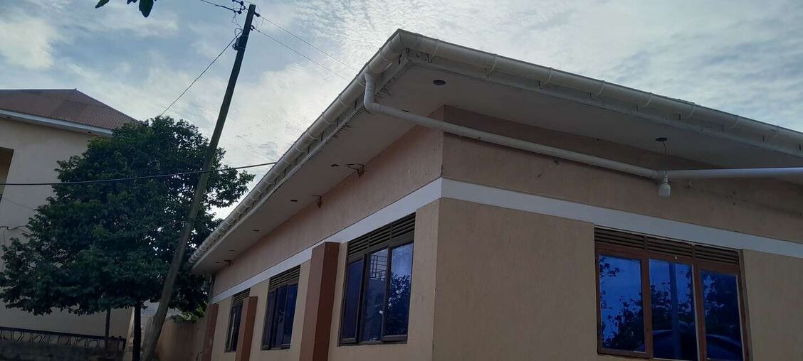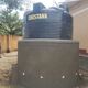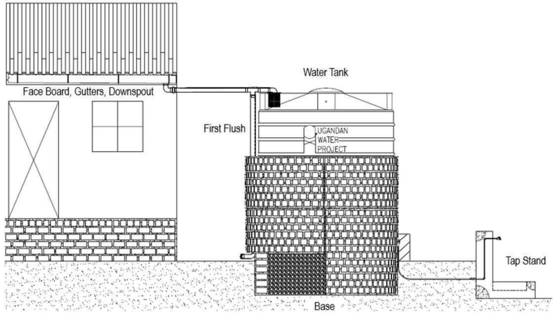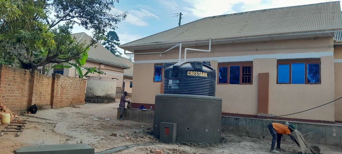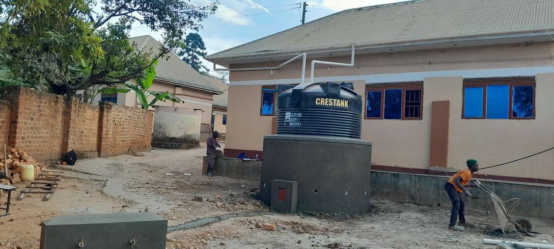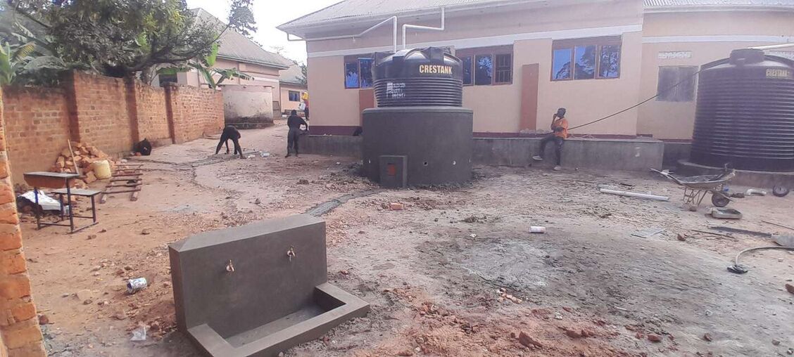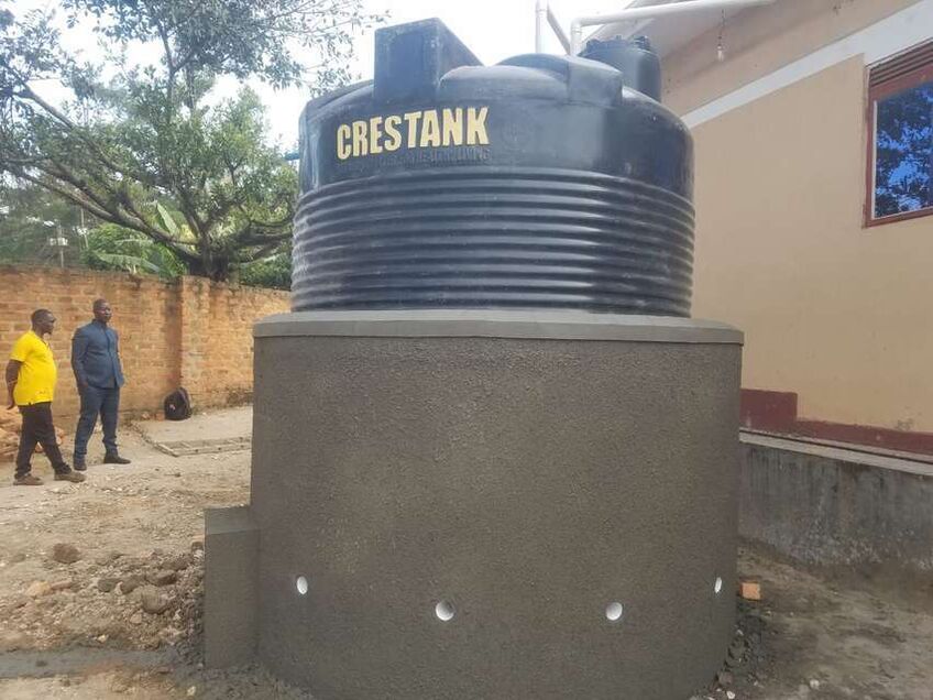Our implementing partner, the Ugandan Water Project, erected a 10,000-liter polyethylene tank on a base made of brick, hardcore, and cement. Once cured, the crew placed the tank on the base, created an overflow hole at the top of the structure, and attached a pipe to it that extends six inches beyond the perimeter of the base. Crew members also attached face boards to the roof of the building adjacent to the tank to create a suitable surface for attaching gutters that will allow water from the metal roof to flow to the tank. Just before the outlet pipe reaches the tank, a “T” joint was inserted to create a first flush, a rudimentary filtration system that reduces the amount of debris and contaminants that enter the tank. The crew then constructed a protective wall around the tank and a tap stand was located slightly downhill from the tank. The rainwater collection system will be paired with four Sawyer Point One water filters to ensure that all water collected from the tank will be safe for drinking.